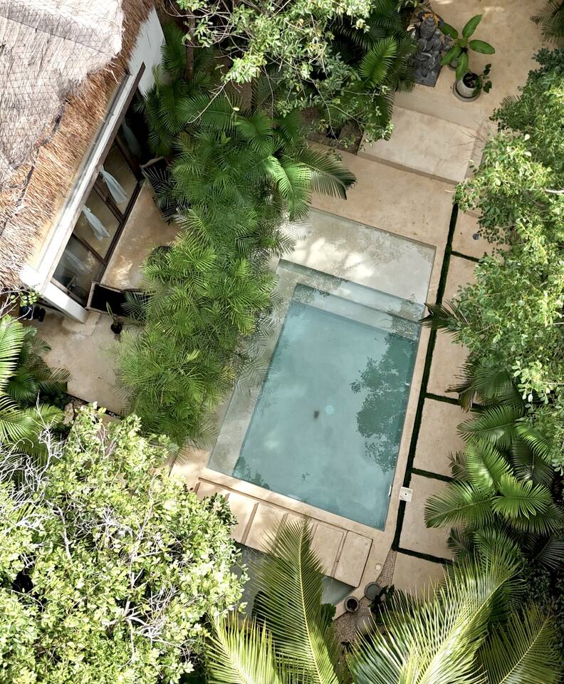 PLEASE READ FULLY AND VIEW ALL LISTING PHOTOS BEFORE BOOKING: This unique two-story detached bungalow is the essence of Tulum living and the perfect vacation getaway. Experience the authentic Tulum lifestyle in our traditional Mayan palapa style overlooking our turquoise blue pool and lush jungle gardens. A fusion of modern minimalist design with spacious living areas, floor to ceiling windows, bringing the beautiful outdoors in, while remaining comfortable inside. It features a fully equipped kitchen open to our lounge style living area, beautifully designed bathroom with shower and private outdoor garden tub on the 1st floor. The bedroom loft on the 2nd floor has a queen bed and gorgeous views of the palapa ceiling and property. Fully equipped kitchen, stunning bathroom with shower and private outdoor garden bathtub. Private patio and wrap around terraces are the perfect place to enjoy your morning coffee. All interior decor is locally made by Mayan artisans giving IKAL it's authentic Tulum vibe. The property has a shared swimming pool, Yoga Shala, and garden area with the two other bungalows on property, featuring a beautiful hard wood staircase leading to separate paths to each private bungalow. Things to be aware and consider before you book: - We have full time security on site at all times - The 2nd bed is the day bed pictured in the listing photos. We provide sheets, pillows, and blanket and it converts to a very comfortable full size mattress - We are located in the jungle in the newest part of Tulum town. The newly opened beach road, Kukulcan, is right around the corner and will bring you to the beach in 12 minutes by car or 25 by bike. - The road to our property is a dirt road and sometimes has bumps and holes due to rain. The road is very manageable with any type of car, moped, or bike, and only adds to the adventure! :) -Renting a car is recommended but we have several taxi services. The taxis in Tulum are expensive, so we always recommend renting a car or moped. -We have Air Conditioners in each bungalow which are intended to cool our guests while they are sleeping, not to cool the entire apartment. We have designed the apartment to cool with fans and natural airflow through the palapa style roof, not by running the AC full blast all day. This was by design to minimize our impact on the world and meet our sustainability values and goals. - We have high speed fiber optic wifi at 50 mbps, but at times can be spotty due to wind and /or technical issues with the main tower, which we can not control. the majority of the time it works perfectly fine - The magical city of Tulum is very popular and in constant development due to its current demand. The entire town is under construction in every neighborhood and therefore, there is sometimes construction noise from simple hammers to power tools. Construction around the city happens from 9 am - 4 pm Monday - Friday - The outdoor garden tub gets luke-warm, not super hot. It is not a jacuzzi - We are in a NATURAL environment surrounded by lush jungle. That means there is the chance to encounter wild life - mosquitos, geckos, squirrels, etc. - nothing is poisonous and nothing will harm you. Our ceiling is made of natural fibers in the traditional Mayan way and sometimes geckos like to make it their home. You might hear them chirping or "scratching" at the fibers. - Tulum experiences occassional power outages due to development. When the power is out, there is no access to running water, lights, wifi, or AC. These outages last usually from 1 - 2 hours and are out of our control. - chef is not included in price of airbnb* ***We do not offer refunds for any of the listed above. Please consider before booking***