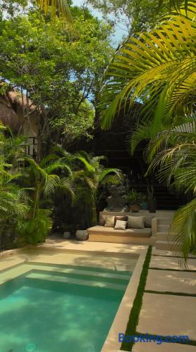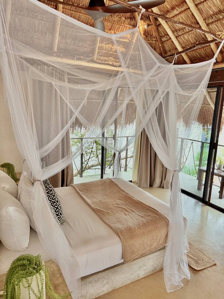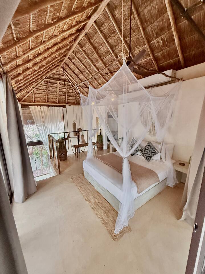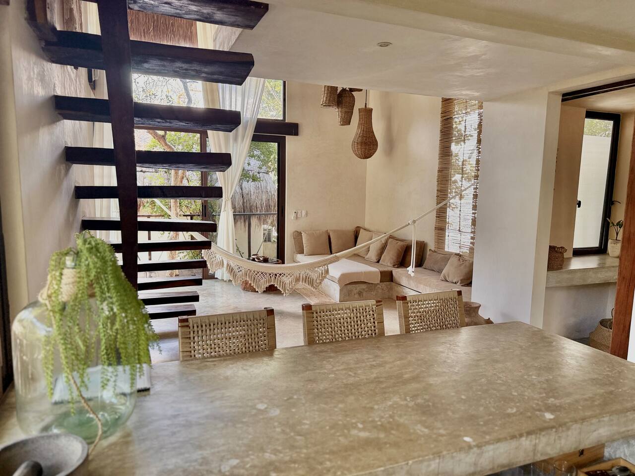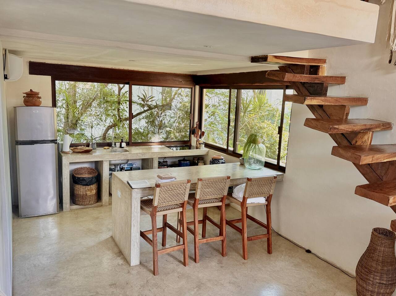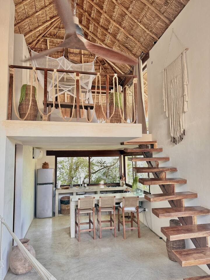 PLEASE READ FULLY THE LISTING DESCRIPTION AND "THE SPACE" AND VIEW ALL LISTING PHOTOS BEFORE BOOKING: This unique two-story penthouse bungalow is the essence of Tulum living and the perfect vacation getaway. Experience the authentic Tulum lifestyle in our traditional mayan palapa style overlooking the Mayan Jungle. A fusion of modern minimalist design with spacious living areas, floor to ceiling windows, connecting the outdoors while being in comfort of indoor space. It features a fully equipped kitchen, design bathroom & shower on the 1st floor. The bedroom loft on 2nd floor has jungle view and garden views with wrap around terrace. Designed in the authentic Tulum style with polished concrete floors, built in furniture and shelves. All interior decor is locally made by Maya artisans giving IKAL it's authentic Tulum vibe. The property has a shared swimming pool, Yoga Shala, and garden area with the two other bungalows on property, featuring a beautiful hard wood staircase leading to separate paths to each private bungalow. Things to be aware and consider before you book: - We have full time security on site at all times - The 2nd bed is the day bed pictured in the listing photos. We provide sheets, pillows, and blanket and it converts to a very comfortable full size mattress - We are located in the jungle in the newest part of Tulum town. The newly opened beach road, Kukulcan, is right around the corner and will bring you to the beach in 12 minutes by car or 25 by bike. - The road to our property is a dirt road and sometimes has bumps and holes due to rain and large trucks. The road is very manageable with any type of car, moped, or bike, and only adds to the adventure! :) -Renting a car is recommended but we have several taxi services. The taxis in Tulum are expensive, so we always recommend renting a car or moped. -We have Air Conditioners in each bedroom which are intended to cool our guests while they are sleeping, not to cool the entire apartment. We have designed the apartment to cool with fans and airflow, not by running the AC full blast all day. This was by design to minimize our impact on the world and meet our sustainability values and goals. - We have high speed fiber optic wifi at 50 mbps, but at times can be spotty due to wind and /or technical issues with the main tower, which we can not control. the majority of the time it works perfectly fine - The magical city of Tulum is very popular and in constant development due to its current demand. The entire town is under construction in every neighborhood and therefore, there is sometimes construction noise from simple hammers to power tools. Construction around the city happens from 9 am - 4 pm Monday - Friday - We are in a NATURAL environment surrounded by lush jungle. That means there is the chance to encounter wild life - mosquitos, geckos, squirrels, etc. - nothing is poisonous and nothing will harm you. Our ceiling is made of natural fibers in the traditional Mayan way and sometimes geckos like to make it their home. You might hear them chirping or "scratching" at the fibers. - Tulum experiences occassional power outages due to development. When the power is out, there is no access to running water, lights, wifi, or AC. These outages last usually from 1 - 2 hours and are out of our control. - Chef is not included in price of airbnb* ***We do not offer refunds for any of the list above. Please consider before booking*