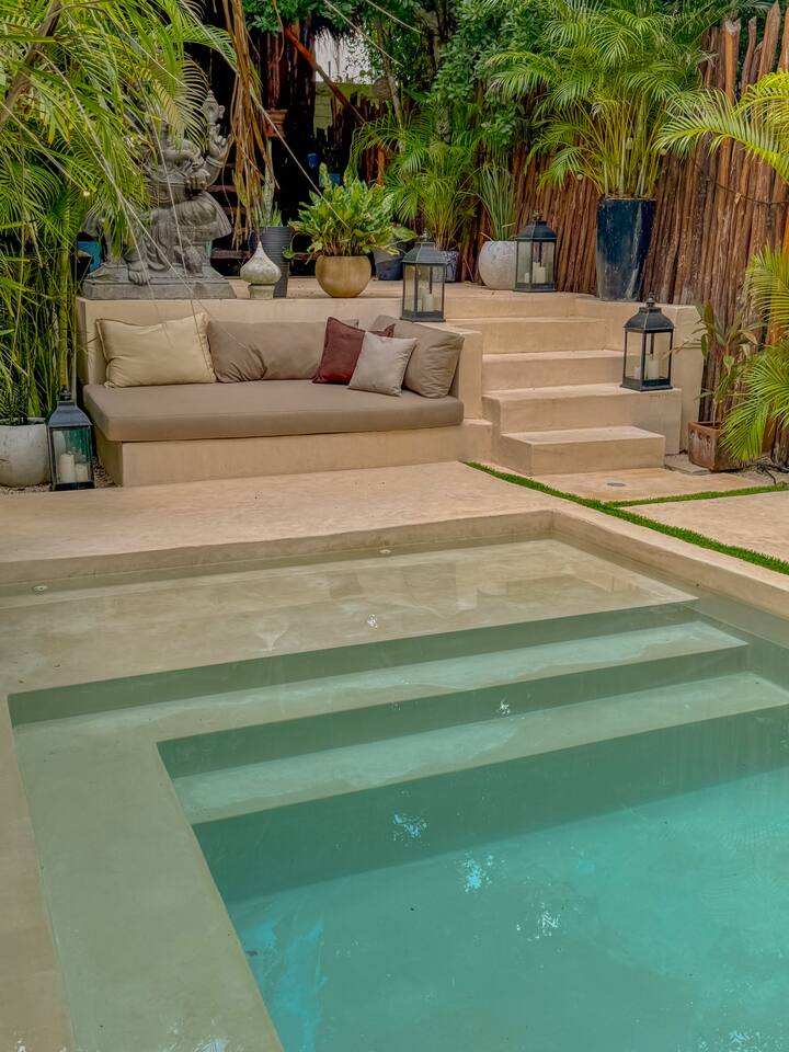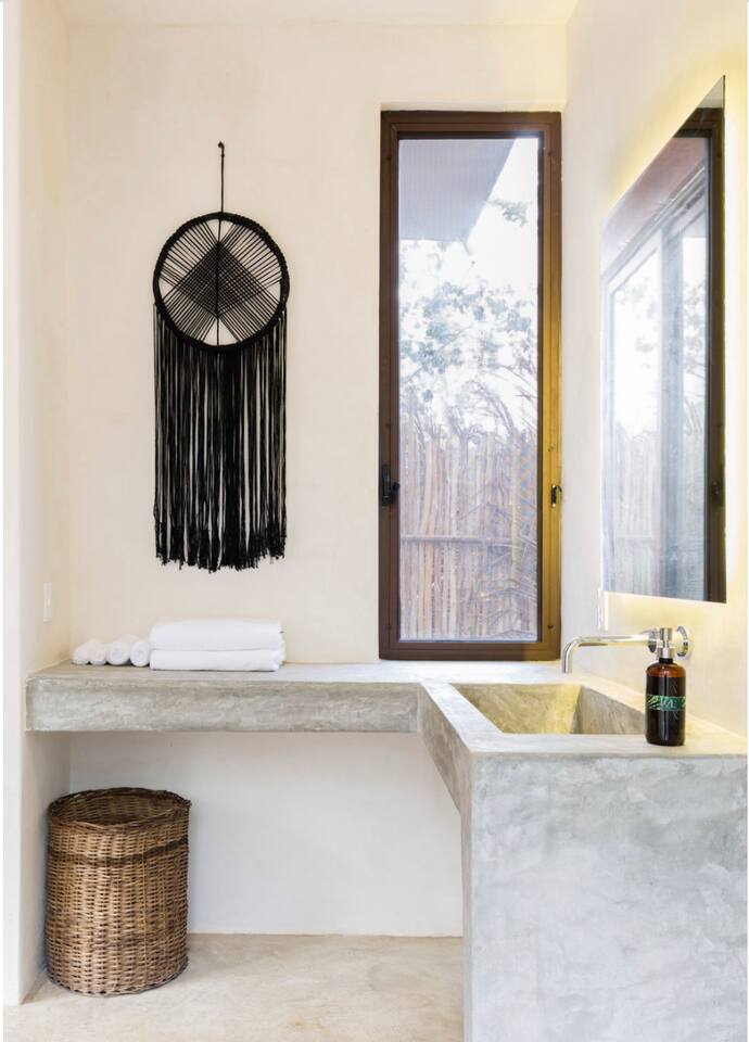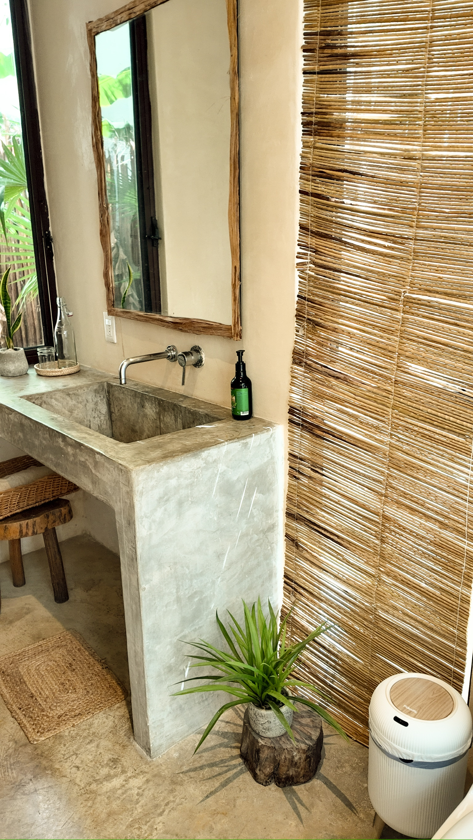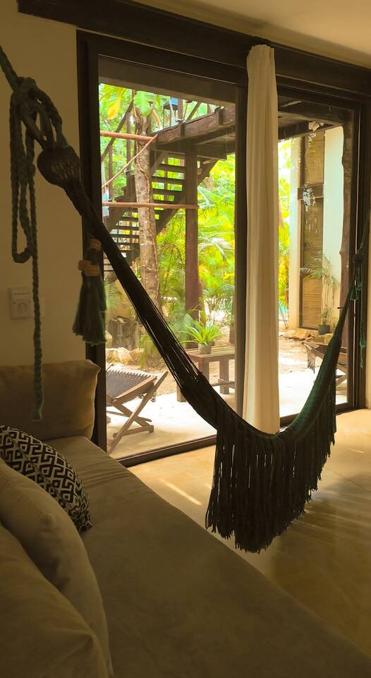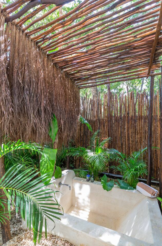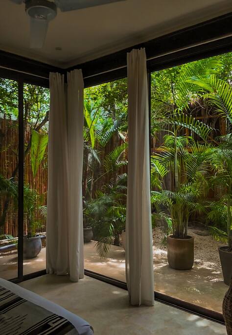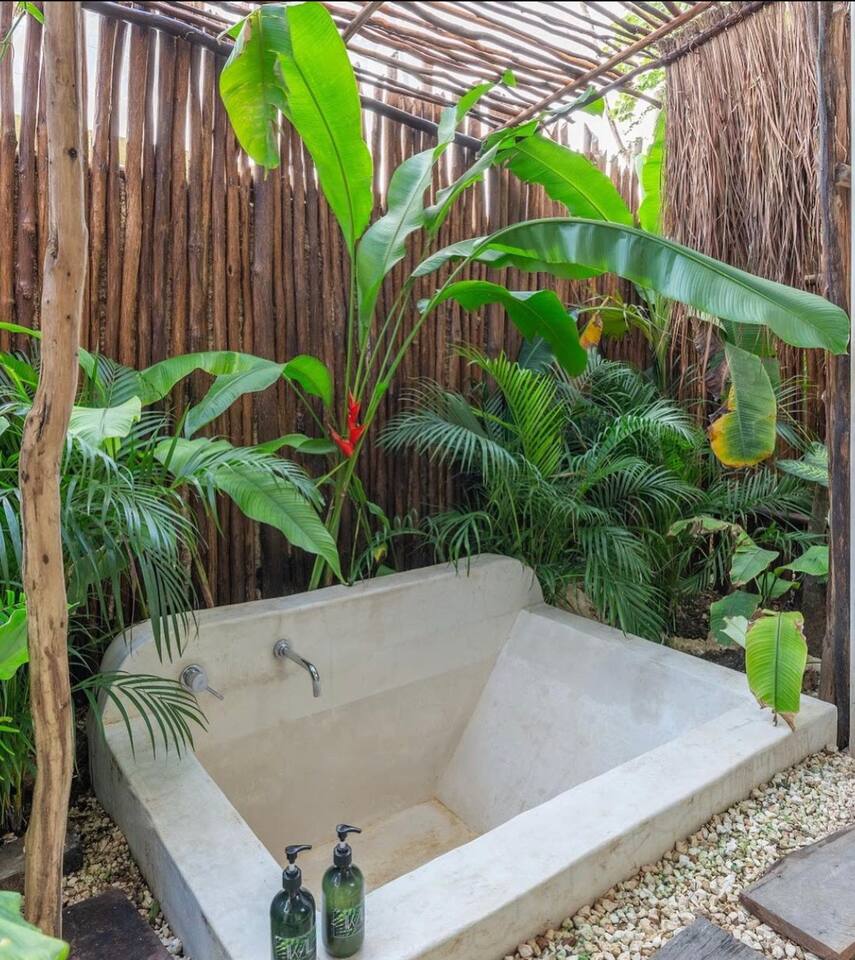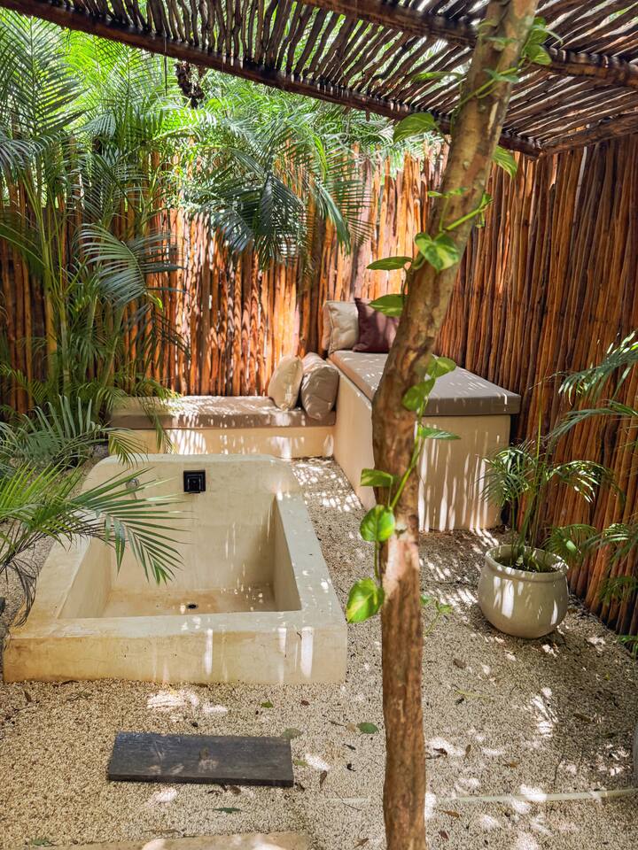 PLEASE READ FULLY THE LISTING DESCRIPTION AND "THE SPACE" AND VIEW ALL LISTING PHOTOS BEFORE BOOKING: Experience the essence of Tulum living and the perfect vacation getaway. XEL is designed in the local minimalist style with polished concrete floors and built in furniture. Featuring floor to ceiling windows in living room and bedroom, with views of our lush jungle garden. Fully equipped kitchen, stunning bathroom with shower and private outdoor garden bathtub. Private backyard and two wrap around terraces are the perfect place to enjoy your morning coffee. All interior decor is locally made by Mayan artisans giving IKAL it's authentic Tulum vibe. The property has a shared swimming pool, Yoga Shala, and garden area with the two other bungalows on property, featuring a beautiful hard wood staircase leading to separate paths to each private bungalow. Things to be aware and consider before you book: - We have full time security on site at all times - The 2nd bed is the day bed pictured in the listing photos. We provide sheets, pillows, and blanket and it converts to a very comfortable twin size mattress - We are located in the jungle in the newest part of Tulum town. The newly opened beach road, Kukulcan, is right around the corner and will bring you to the beach in 12 minutes by car or 25 by bike. - The road to our property is a dirt road and sometimes has bumps and holes due to rain and ongoing construction. The road is very manageable with any type of car, moped, or bike, and only adds to the adventure! :) -Renting a car is recommended but we have several taxi services. The taxis in Tulum are expensive, so we always recommend renting a car or moped. -We have Air Conditioners in each bedroom which are intended to cool our guests while they are sleeping, not to cool the entire apartment. We have designed the apartment to cool with fans and natural airflow through the palapa style roof, not by running the AC full blast all day. This was by design to minimize our impact on the world and meet our sustainability values and goals. - We have high speed fiber optic wifi at 50 mbps, but at times can be spotty due to wind and /or technical issues with the main tower, which we can not control. the majority of the time it works perfectly fine - The magical city of Tulum is very popular and in constant development due to its current demand. The entire town is under construction in every neighborhood and therefore, there is sometimes construction noise from simple hammers to power tools. Construction around the city happens from 9 am - 4 pm Monday - Friday - the outdoor garden tub gets luke-warm, not super hot - Tulum experiences occasional power outages due to development. When the power is out, there is no access to running water, lights, wifi, or AC. These outages last usually from 1 - 2 hours and are out of our control. - chef is not included in airbnb price ***We do not offer refunds for any of the listed above. Please consider before you book***