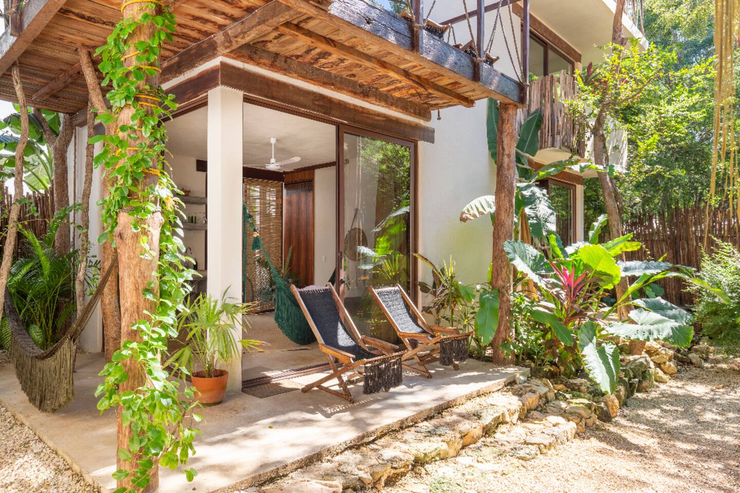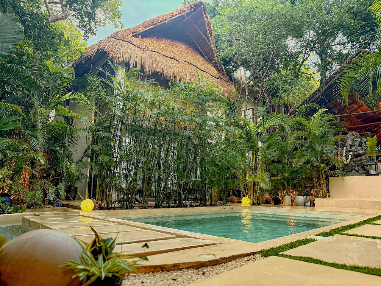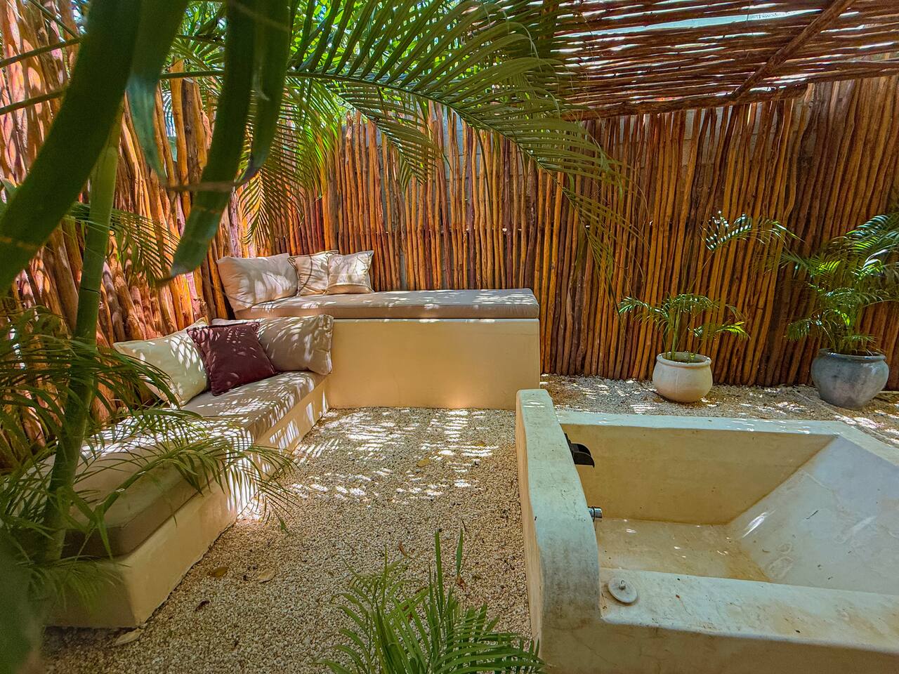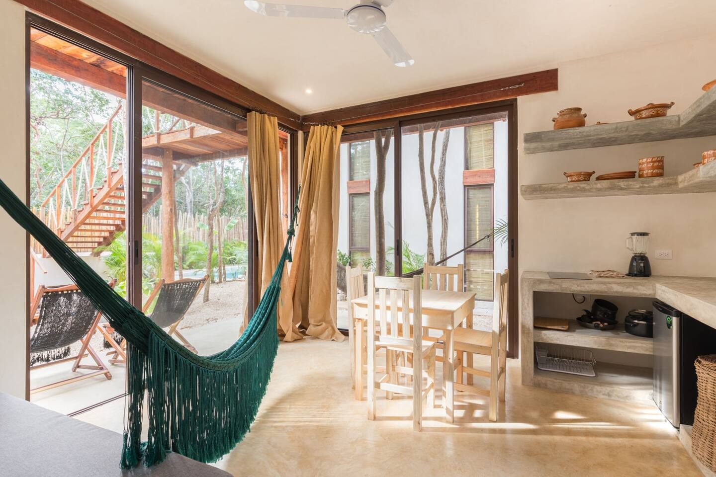 PLEASE READ FULLY THE LISTING DESCRIPTION AND "THE SPACE" AND VIEW ALL LISTING PHOTOS BEFORE BOOKING: Experience the essence of Tulum living and the perfect vacation getaway. XEL is designed in the local minimalist style with polished concrete floors and built in furniture. Featuring floor to ceiling windows in living room and bedroom, with views of our lush jungle garden. Fully equipped kitchen, stunning bathroom with shower and private outdoor garden bathtub. Private backyard and two wrap around terraces are the perfect place to enjoy your morning coffee. All interior decor is locally made by Mayan artisans giving IKAL it's authentic Tulum vibe. The property has a shared swimming pool, Yoga Shala, and garden area with the two other bungalows on property, featuring a beautiful hard wood staircase leading to separate paths to each private bungalow. Things to be aware and consider before you book: - We have full time security on site at all times - The 2nd bed is the day bed pictured in the listing photos. We provide sheets, pillows, and blanket and it converts to a very comfortable twin size mattress - We are located in the jungle in the newest part of Tulum town. The newly opened beach road, Kukulcan, is right around the corner and will bring you to the beach in 12 minutes by car or 25 by bike. - The road to our property is a dirt road and sometimes has bumps and holes due to rain and ongoing construction. The road is very manageable with any type of car, moped, or bike, and only adds to the adventure! :) -Renting a car is recommended but we have several taxi services. The taxis in Tulum are expensive, so we always recommend renting a car or moped. -We have Air Conditioners in each bedroom which are intended to cool our guests while they are sleeping, not to cool the entire apartment. We have designed the apartment to cool with fans and natural airflow through the palapa style roof, not by running the AC full blast all day. This was by design to minimize our impact on the world and meet our sustainability values and goals. - We have high speed fiber optic wifi at 50 mbps, but at times can be spotty due to wind and /or technical issues with the main tower, which we can not control. the majority of the time it works perfectly fine - The magical city of Tulum is very popular and in constant development due to its current demand. The entire town is under construction in every neighborhood and therefore, there is sometimes construction noise from simple hammers to power tools. Construction around the city happens from 9 am - 4 pm Monday - Friday - the outdoor garden tub gets luke-warm, not super hot - Tulum experiences occasional power outages due to development. When the power is out, there is no access to running water, lights, wifi, or AC. These outages last usually from 1 - 2 hours and are out of our control. - chef is not included in airbnb price ***We do not offer refunds for any of the listed above. Please consider before you book***
